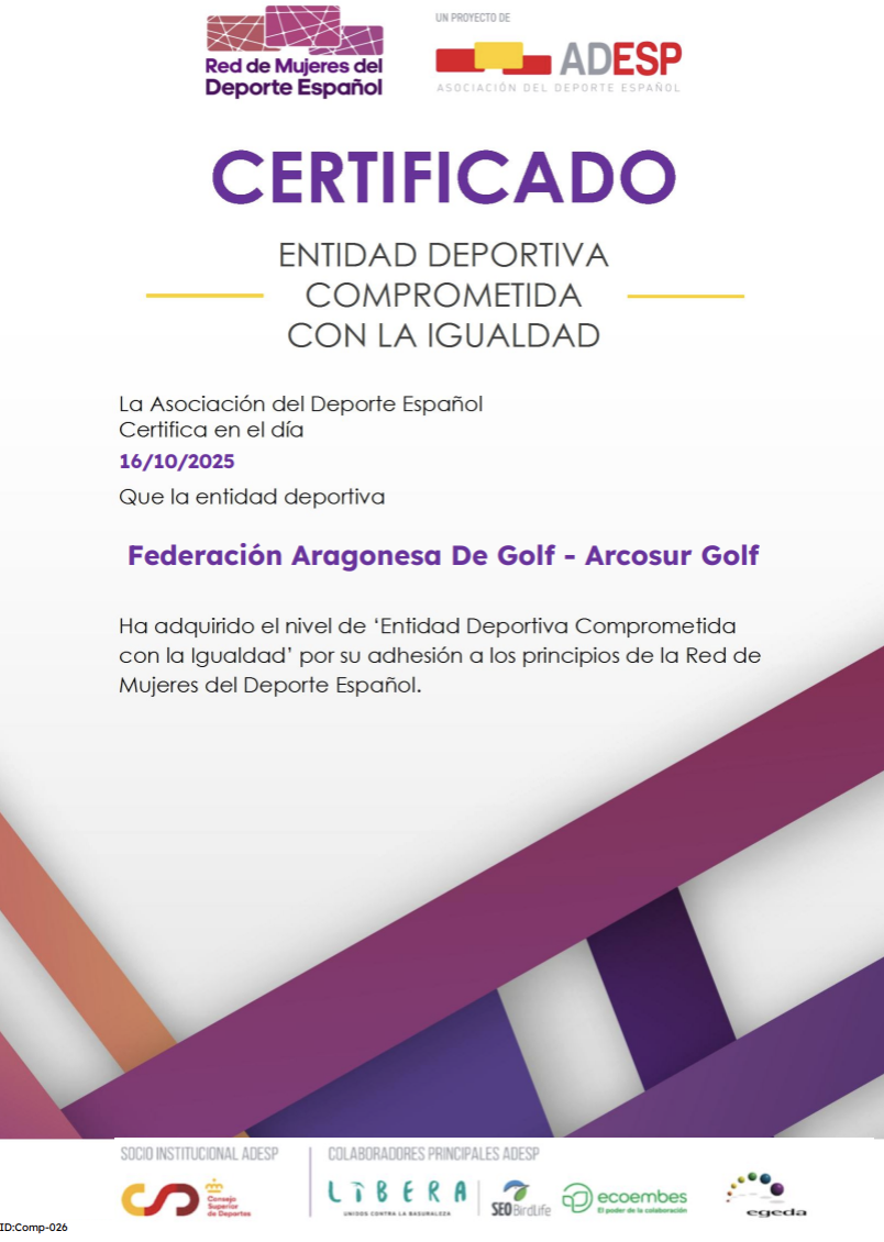 Desde la Federación Aragonesa de Golf, junto a Arcosur Golf, hemos sido reconocidos por la Asociación del Deporte Español (ADESP) y la Red de Mujeres del Deporte Español como Entidad Deportiva Comprometida con la Igualdad, por nuestra adhesión a los principios que promueven la igualdad de oportunidades entre mujeres y hombres en el ámbito deportivo.